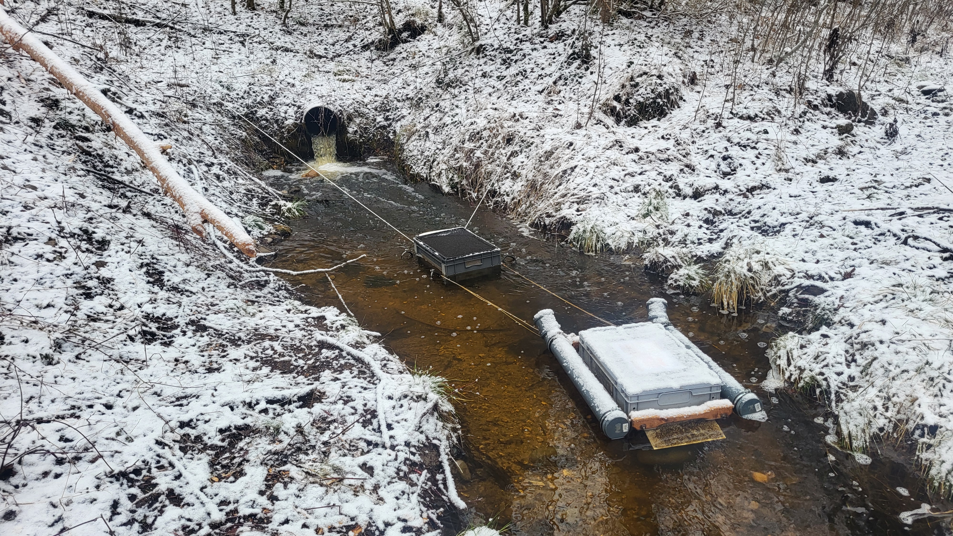 Anfang Dezember wurden bei 3.9°C 15.000 Bachforelleneier in die zwei neu gebauten Schwimmboxen eingebracht. Vorteil dieser Boxen ist, dass man durchgehend Hegemaßnahmen in Form von Aussortieren abgestorbener Individuen vornehmen kann, während diese sich bei naturnaher Umgebung entwickeln können. Zudem ist man weniger vom Sedimenteintrag geplagt, wie es teilweise bei den WV (Whitlock-Vibert) Boxen auftreten kann.